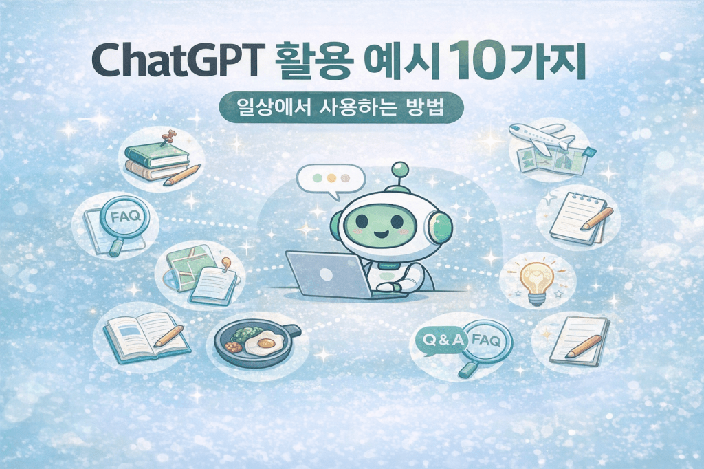 ChatGPT는 다양한 상황에서 활용할 수 있는 인공지능 서비스입니다. 이 글에서는 일상생활, 공부, 업무 등 여러 분야에서 사용할 수 있는 ChatGPT 활용 예시 10가지를 소개합니다. 처음 사용하는 사람도 이해할 수 있도록 실제 사용 사례 중심으로 설명합니다.